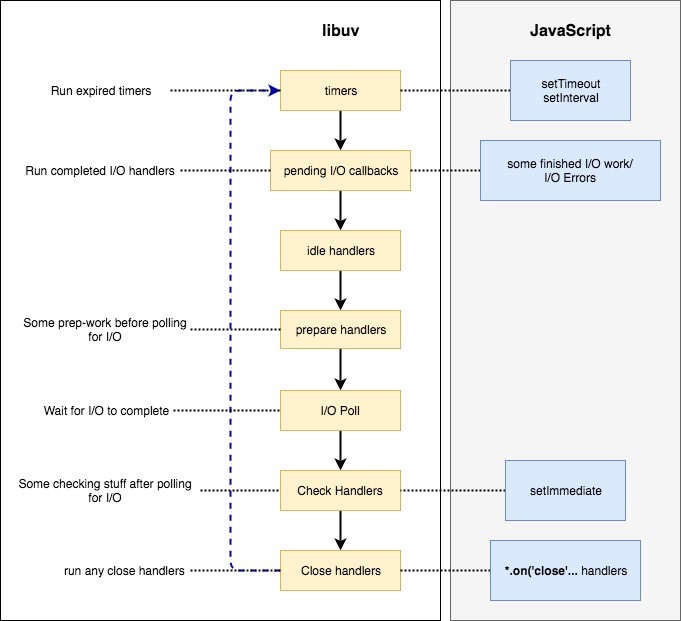 注意:技术上讲,poll 阶段控制了 timers 何时被执行