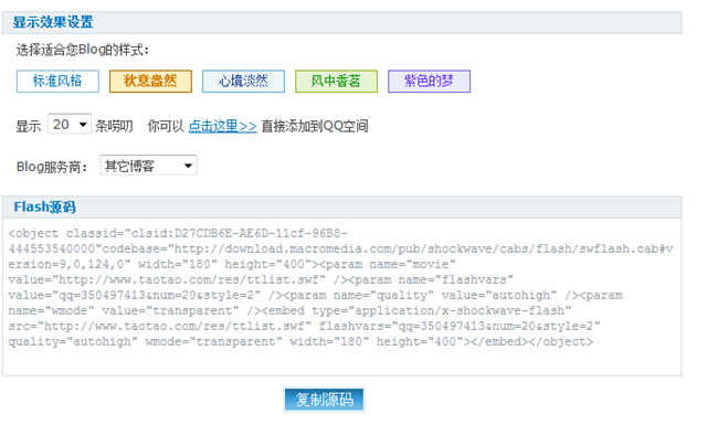 在样式那选择你喜欢的样式,还要注意的一点是,Flash的字体背景是透明的,我黑色背景就只能是选”秋色盎然“,不然的话字体在我的博客上看不到。让吧代码发坐下来,我的代码如下: